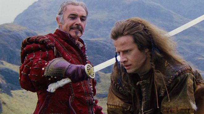 Le film suivant a marqué une génération, et a d’ailleurs grandement contribué à l’engouement pour les sabres japonais à sa sortie, les ventes et les prix ayant beaucoup augmentés. Highlander, et sa fameuse histoire des guerriers immortels qui doivent se couper la tête pour prendre le pouvoir des autres. A la fin il n’en restera qu’un, devise des immortels, qui ne savent pas combien ils sont, et combien de temps dureront tous ces affrontements. C’est dans ce contexte que nait Conrad McLeod, il y a 400 ans, en écosse, avant de découvrir qu’il est immortel et qu’il va perpétuer la tradition des duels à mort. Le film donnera lieu plus tard à des suites, et une série (avec Ducan McLeod, cousin éloigné de Conrad). Mais c’est bien du film dont nous parlons ici ou plutôt des films, car c’est la même lame tout au long de la saga . Le sabre du personnage principal est tout simplement magnifique, avec un manche en ivoire gravé, une garde dorée de toute beauté et sa lame si caractéristique des sabres japonais.